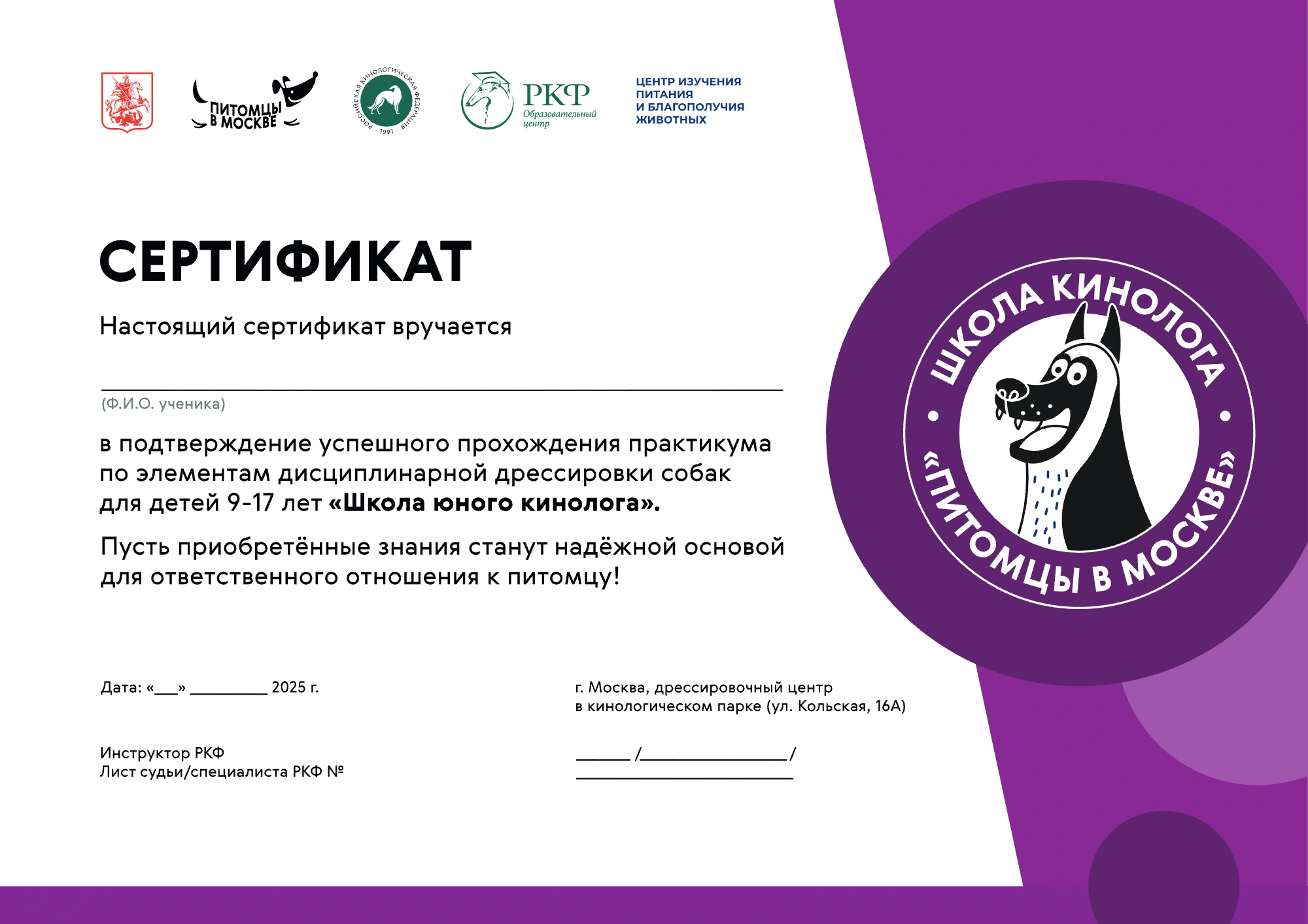 В рамках «Школы кинолога» у московских детей появилась также возможность заниматься оффлайн с инструкторами Российской кинологической федерации (РКФ). Первые уроки прошли в начале осени, после прохождения юные участники получили именные сертификаты о прохождении курса.