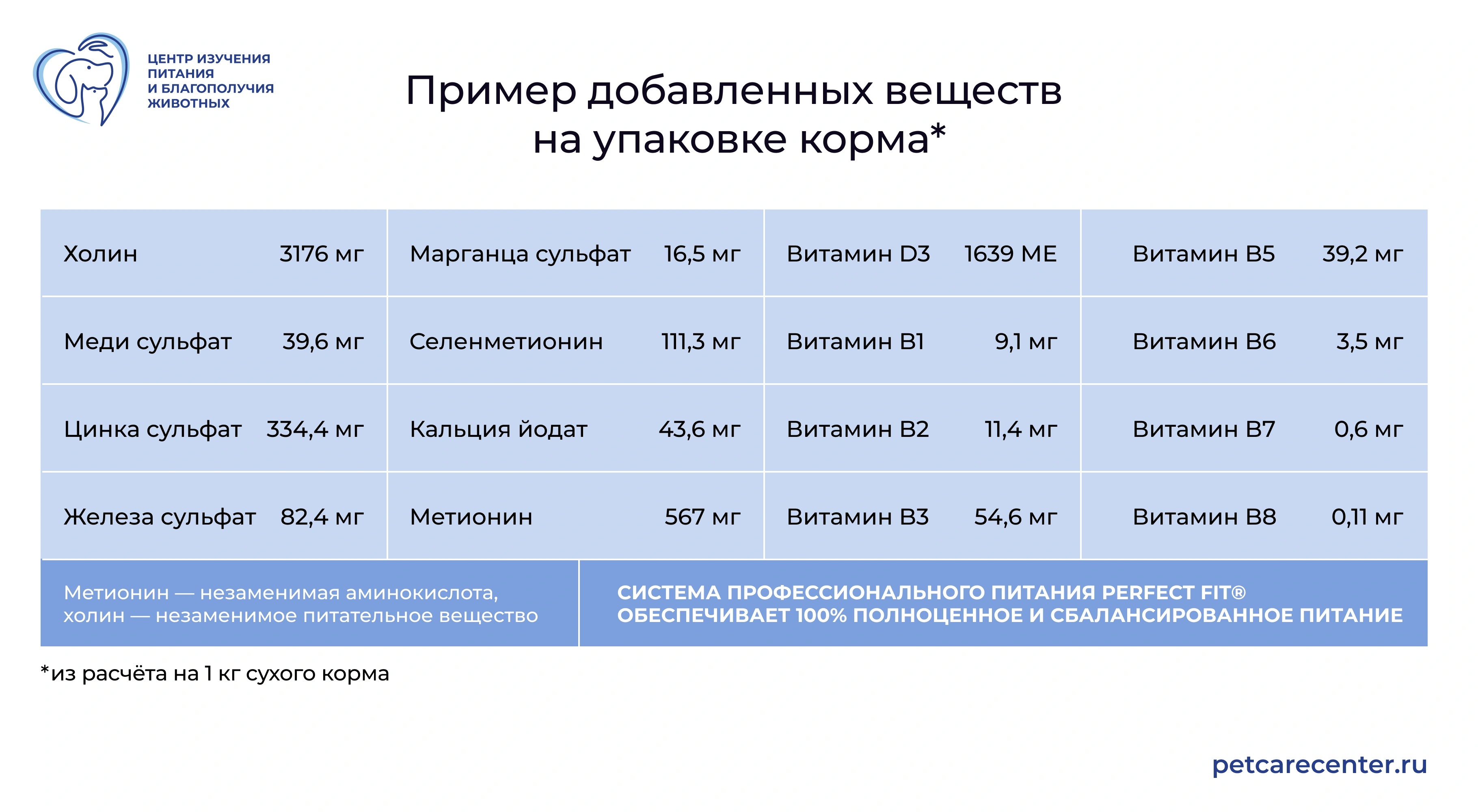 Ткани животных содержат более 45 минеральных элементов и ещё больше их соединений в самых разных концентрациях и формах, а в среднем организм самих питомцев примерно на 4% состоит из минералов. При этом эти микронутриенты в зависимости от типа соединения и присутствия в рационе связывающих компонентов могут иметь разную усвояемость. Всё это учитывается производителями кормов, которые выбирают минералы с оптимальной биодоступностью, и исследуется в Центре изучения питания и благополучия животных посредством оценки зольности фекалий кошек и собак на фоне кормления тем или иным рационом.