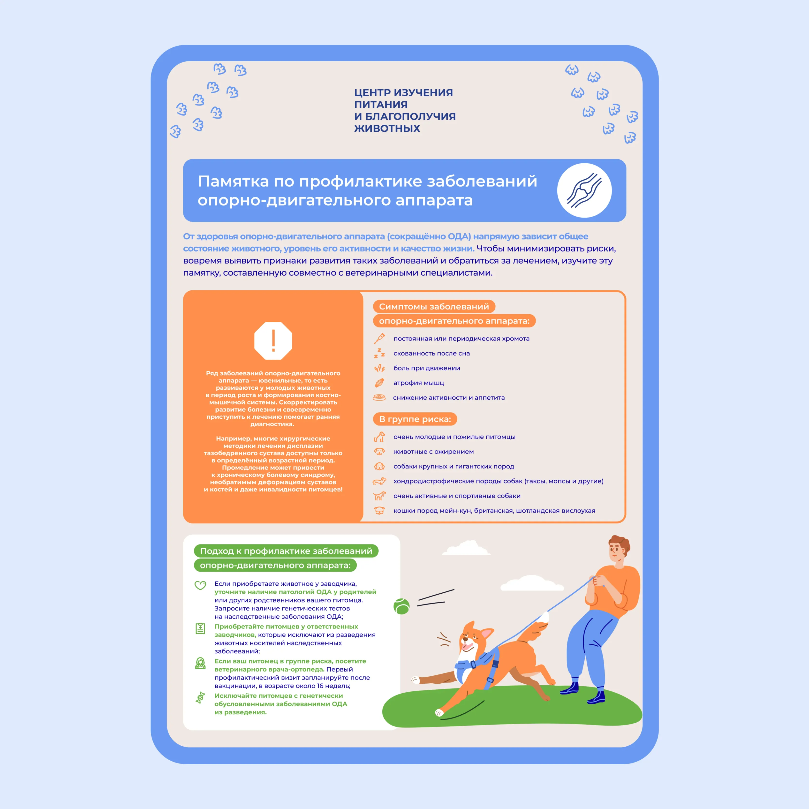 Чтобы не запутаться в обилии информации об уходе за здоровьем питомцев, важно заручиться поддержкой профессионалов. Именно поэтому эксперты Центра изучения питания и благополучия животных совместно с ветеринарными врачами разработали пять памяток по профилактике распространённых заболеваний кошек и собак: в них вы найдёте рекомендации по уходу за ротовой полостью, поддержанию здоровья мочевыделительной системы, кожи и её производных, желудочно-кишечного тракта и опорно-двигательного аппарата.